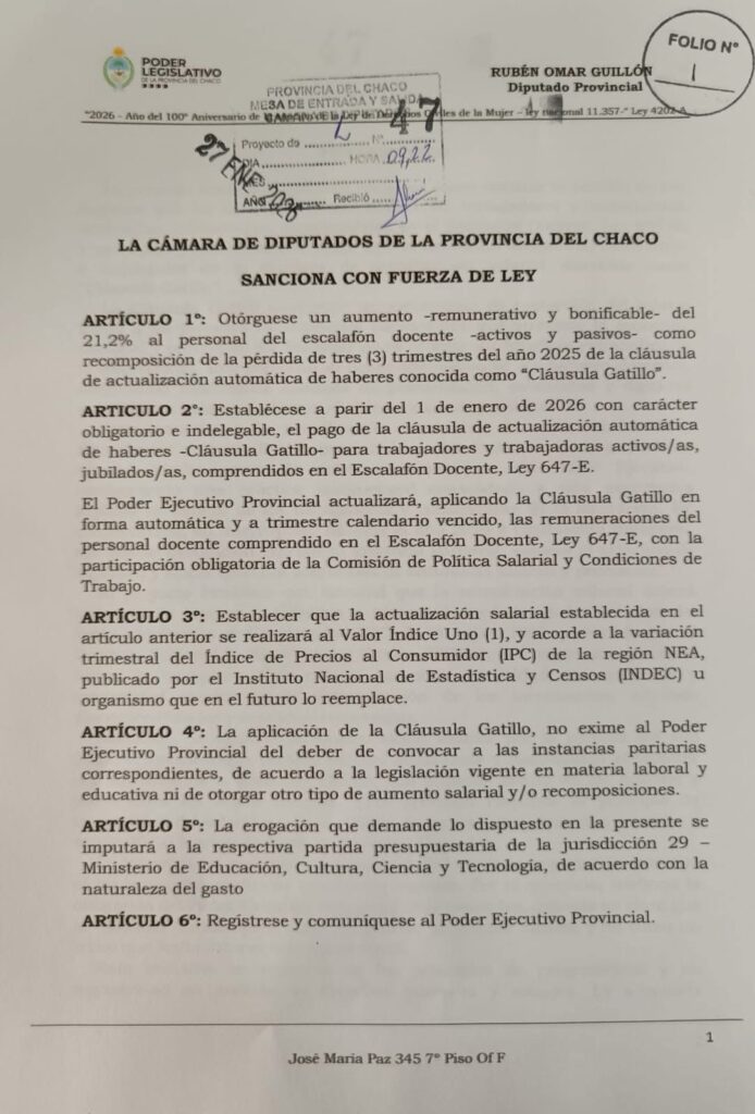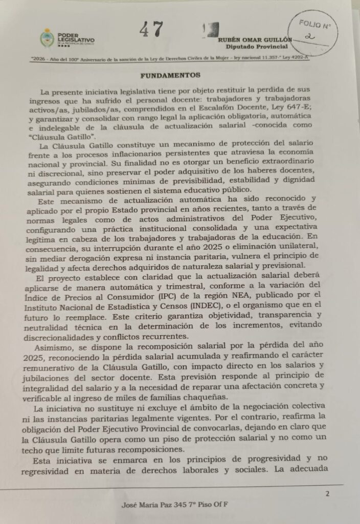 Desde el peronismo señalaron que la Cláusula Gatillo, creada y garantizada durante las gestiones anteriores, es un derecho conquistado que Zdero intentó desmantelar. El proyecto de ley busca que la actualización sea automática, trimestral e intocable, basándose en el IPC del NEA para que ningún docente chaqueño cobre por debajo de la inflación.