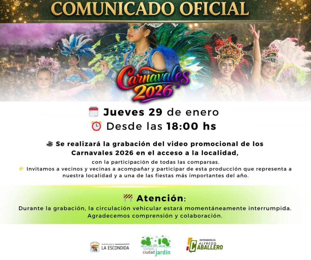 El Municipio, bajo la gestión del Intendente Alfredo Caballero, convocó a la comunidad a participar de la grabación del video promocional de los Carnavales 2026, un evento que promete capturar la esencia festiva de la localidad.