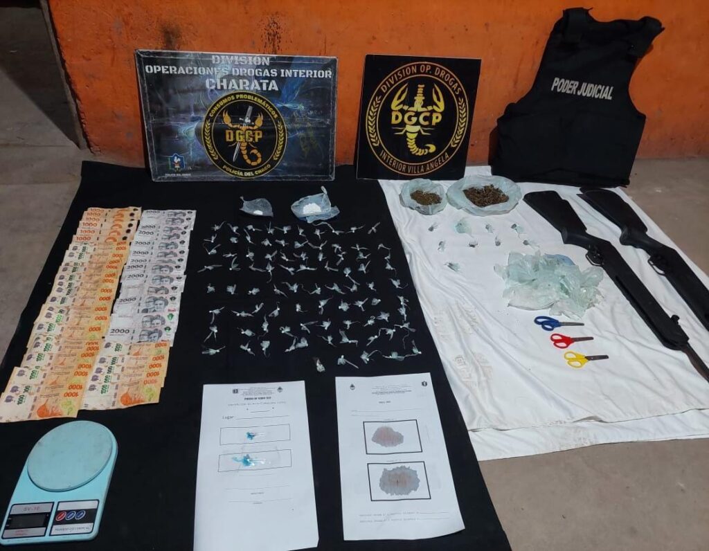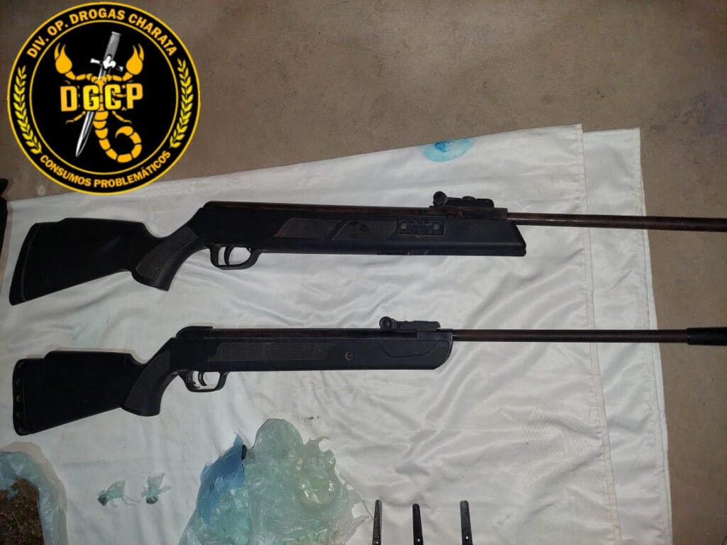 Como resultado del primer allanamiento, los efectivos procedieron a la aprehensión de un hombre de 28 años, logrando el secuestro de 80,84 gramos de marihuana y 28,5 gramos de cocaína, además de $59.000 en efectivo, una balanza digital y dos rifles de aire comprimido.