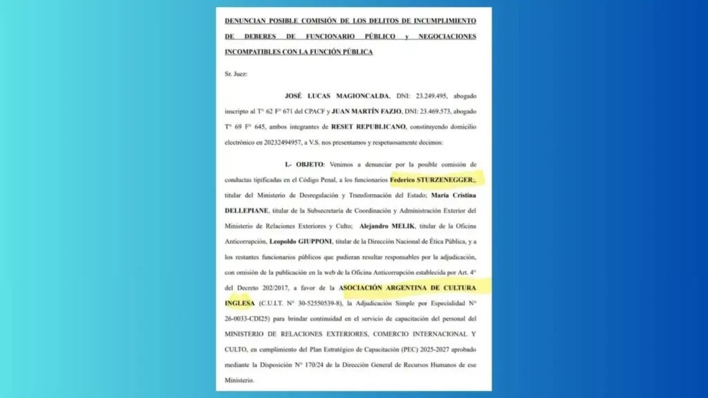 La presentación judicial cuestiona el proceso mediante el cual la Asociación Argentina de Cultura Inglesa resultó contratada por la Cancillería argentina, señalando que no se habría cumplido con la difusión exigida por el Decreto 202/2017, normativa que establece mecanismos de transparencia en contrataciones públicas que involucren posibles conflictos de interés.