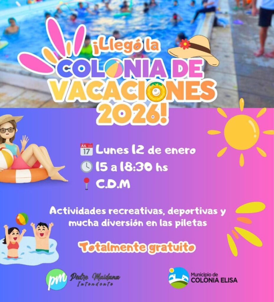 La Colonia de Vacaciones 2026 dará inicio el lunes 12 de enero, será de acceso gratuito y se desarrollará en el Club Deportivo Municipal, reafirmando el compromiso del Estado local con el bienestar de las infancias y juventudes de Colonia Elisa.