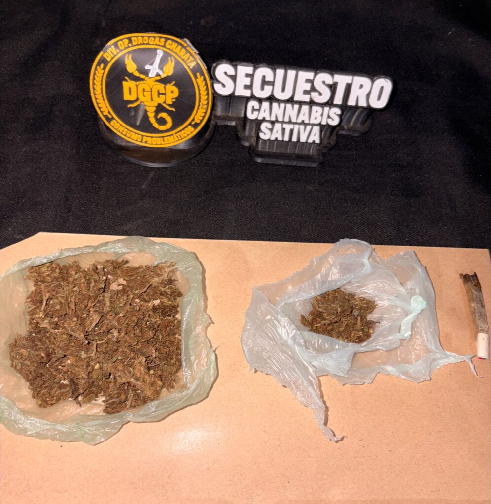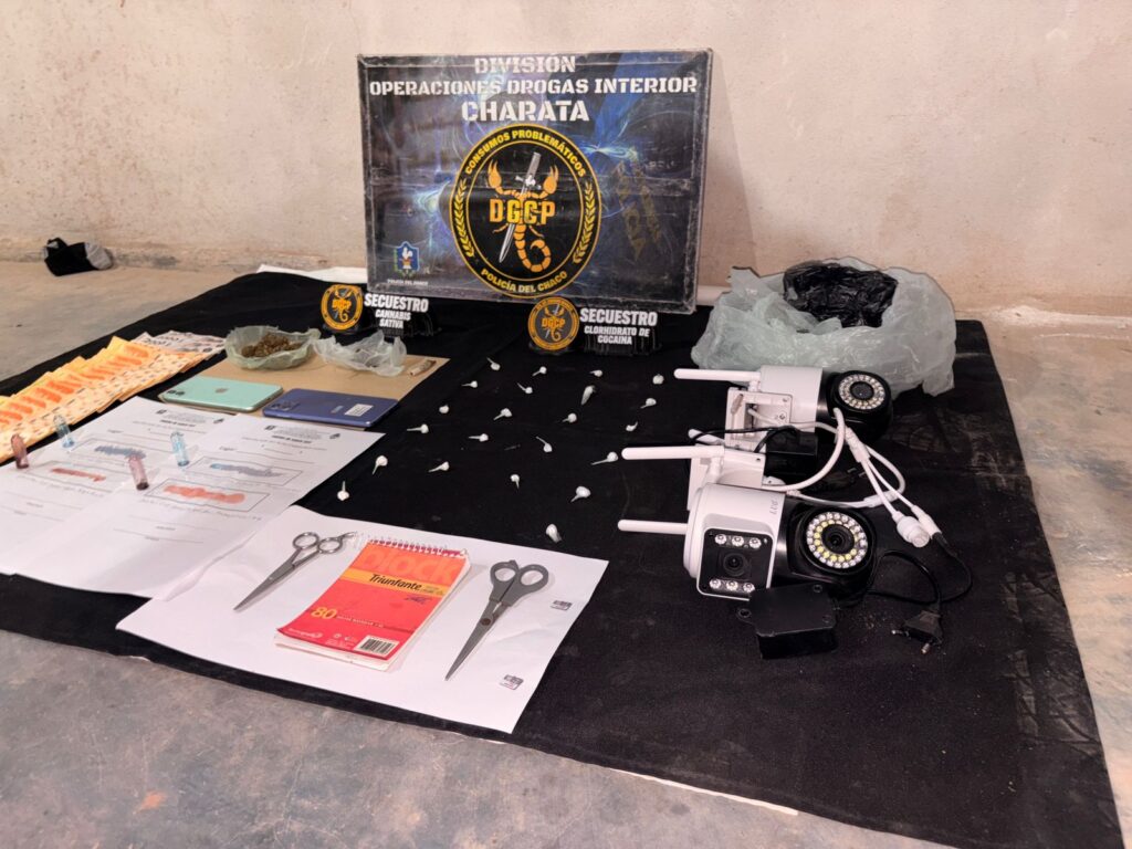 Durante la requisa, los efectivos secuestraron 21 envoltorios tipo “bochitas” que contenían un total de 6 gramos de cocaína, además de varios envoltorios con más de 17 gramos de marihuana. También incautaron recortes de nylon, dos tijeras, una libreta con anotaciones, 31.000 pesos en efectivo, dos teléfonos celulares y dos cámaras de seguridad con sus respectivas memorias.
