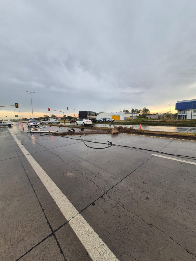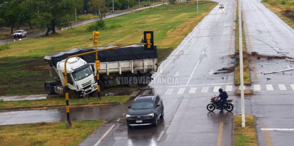 En su trayectoria, el transporte pesado colisionó primero contra una jirafa de alumbrado público situada en el cantero central y luego impactó contra el semáforo ubicado en la mencionada intersección, provocando daños en el tendido eléctrico y en la señalización vial.