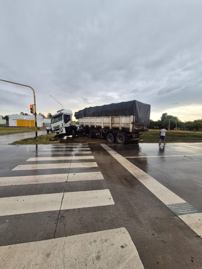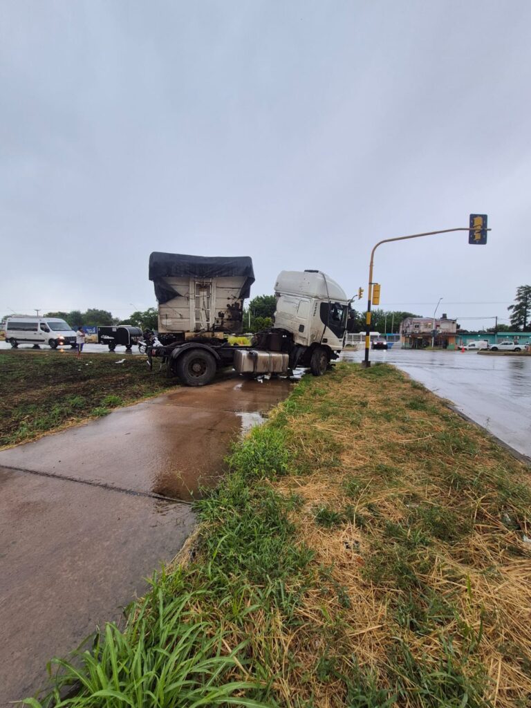 Un camión de gran porte protagonizó este lunes 23/02 por la tarde un siniestro vial sobre la Ruta Nacional 11, a la altura del kilómetro 1002, en la intersección con la calle Bouque. El hecho se produjo alrededor de las 16:20, en medio de condiciones climáticas adversas, y dejó importantes daños materiales en la infraestructura pública.