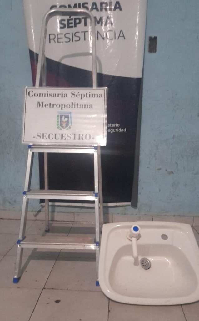 El procedimiento se inició luego de la denuncia radicada por un hombre de 58 años, propietario de un local ubicado sobre avenida Las Heras al 2650. Según indicó el damnificado, al presentarse en el inmueble constató que personas desconocidas habían ingresado tras violentar un ventiluz y sustrajeron una escalera de aluminio de cinco peldaños y un lavatorio de loza color blanco.