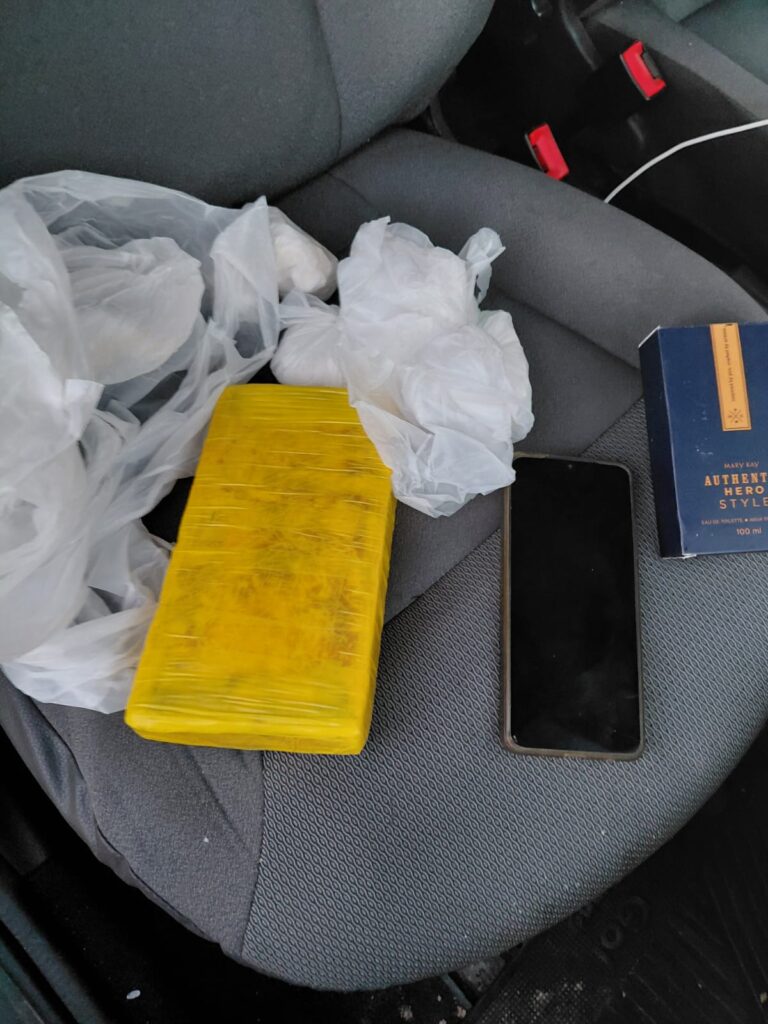 Durante la inspección del rodado, los uniformados detectaron una mochila negra ubicada en el asiento delantero. En su interior hallaron un paquete rectangular de color amarillo y tres bolsas de polietileno que contenían una sustancia blanquecina. Tras la intervención de la División Microtráfico y la realización de la prueba de campo, se confirmó que se trataba de cocaína.