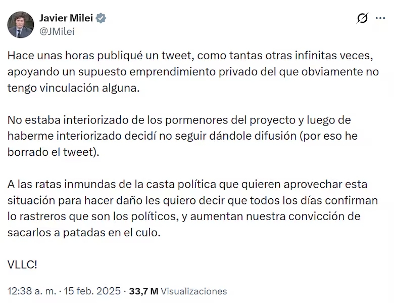 Esa redacción dejaba con vida a $LIBRA, en momentos en que sus promotores luchaban por rescatarla. Milei finalmente optó por otra redacción, a las 0:38 del sábado 15, aunque tomó algunas ideas: “Hace unas horas publiqué un tweet, como tantas otras infinitas veces, apoyando un supuesto emprendimiento privado del cual obviamente no tengo vinculación alguna. No estaba interiorizado de los pormenores del proyecto y luego de haberme interiorizado decidí no seguir dándole difusión (por eso he borrado el tweet)”. Lo completó con un ataque “a las ratas inmundas de la casta política”.