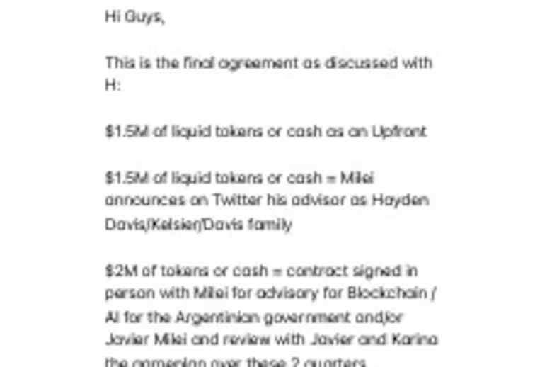 Sigue: «$1.5M de tokens o cash como pago adelantado. $1.5 millones en tokens o cash – Milei anuncia en Twitter como su asesor a Hayden Davis/Kelsien/familia Davis».