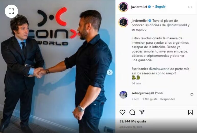 Para encontrar algo parecido hay que remontarse al 18 diciembre de 2021, cuando avaló en Instagram a la financiera digital CoinX. Milei acababa de asumir su banca de diputado nacional. “Están revolucionando la manera de inversión para ayudar a los argentinos escapar de la inflación. Puedes simular tu inversión en pesos, dólares o criptomonedas y obtener una ganancia. Escribanles a CoinX de parte mía así los asesoran con lo mejor”, escribió. Aquello terminó en escándalo, con miles de estafados y el dueño detenido.