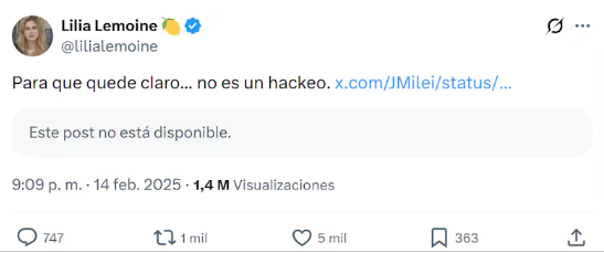 No explicó por qué esperó 5 horas y 37 minutos para retractarse, pese a que la cotización de $LIBRA se había desplomado mucho antes. De paso, ¿por qué la diputada libertaria Lilia Lemoine sintió que era necesario aclarar, a las 21.09, que a Milei no le habían hackeado la cuenta? Los opositores que investigaron el caso en el Congreso siempre sospecharon que en esas horas de confusión hubo un intento desesperado de evitar el colapso total de $LIBRA. Para eso se requería despejar dudas sobre el apoyo de Milei a la iniciativa.