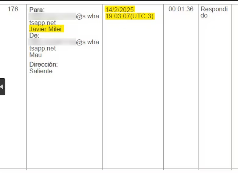 El peritaje sobre el teléfono de Novelli demuestra que solo ese 14 de febrero Milei y Novelli intercambiaron 7 llamados y hablaron un total de 13 minutos y 10 segundos. Karina Milei participó en otras 6 llamadas. Hubo contactos en los minutos previos al tuit original de Milei, coincidente con el lanzamiento del criptoactivo, y en los instantes inmediatamente posteriores.
