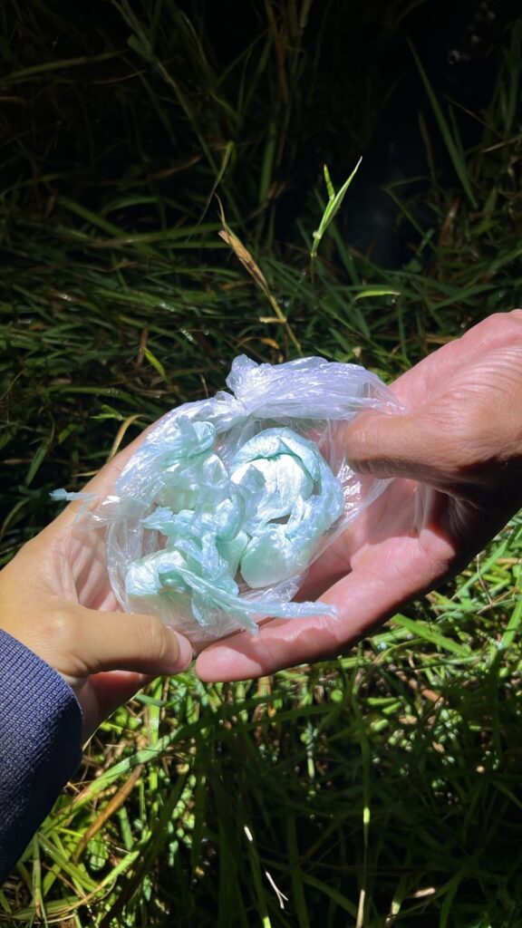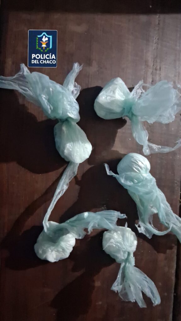 Al inspeccionar el elemento descartado, los efectivos hallaron un envoltorio de polietileno transparente que contenía cinco paquetes más pequeños, conocidos como “bochas”, con una sustancia blanquecina en su interior, tanto compacta como disgregada, lo que hace presumir que se trataría de estupefacientes.