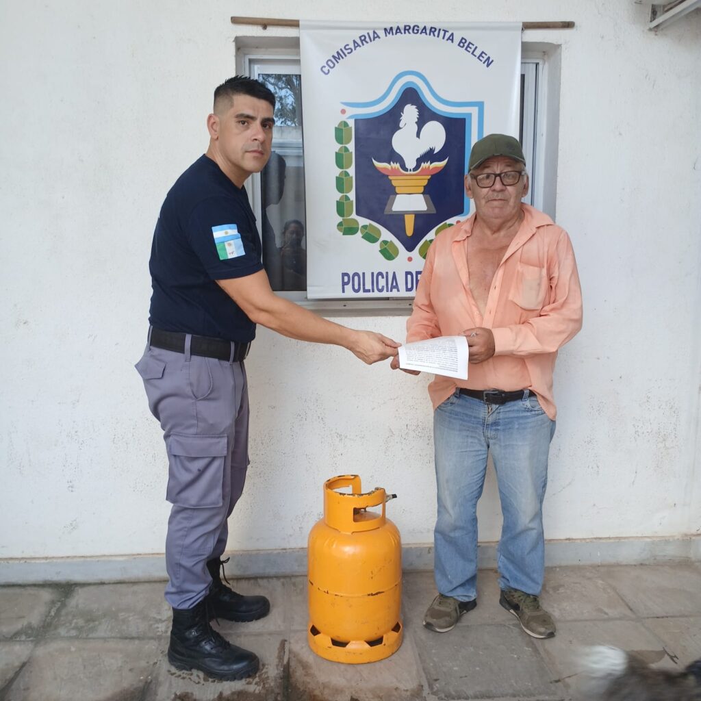 La intervención se inició tras la denuncia de un vecino de 65 años, quien informó que alrededor de las 7:30 de la mañana personas desconocidas le habían robado una garrafa de 10 kilos, de color amarillo, desde su domicilio ubicado sobre calle Marcos.