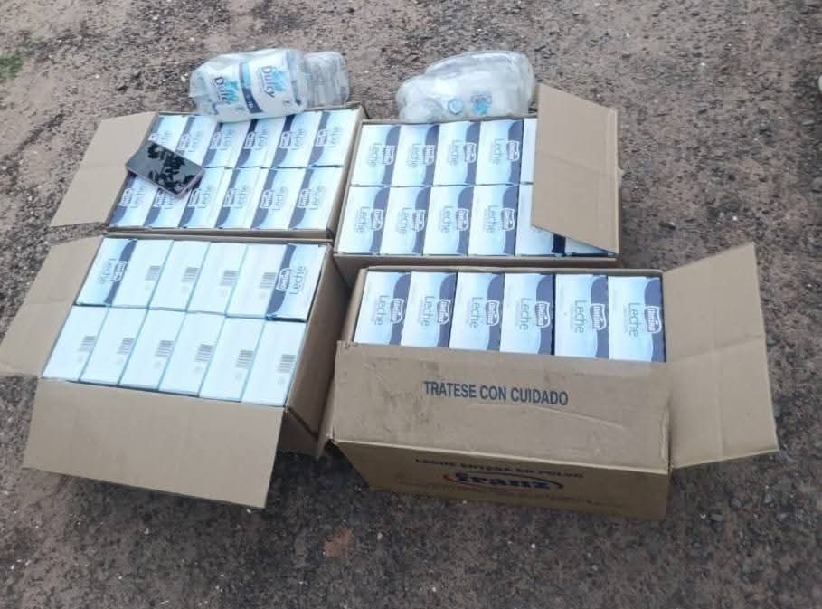 - Cajas de leche y packs de azúcar con el sello del Estado.