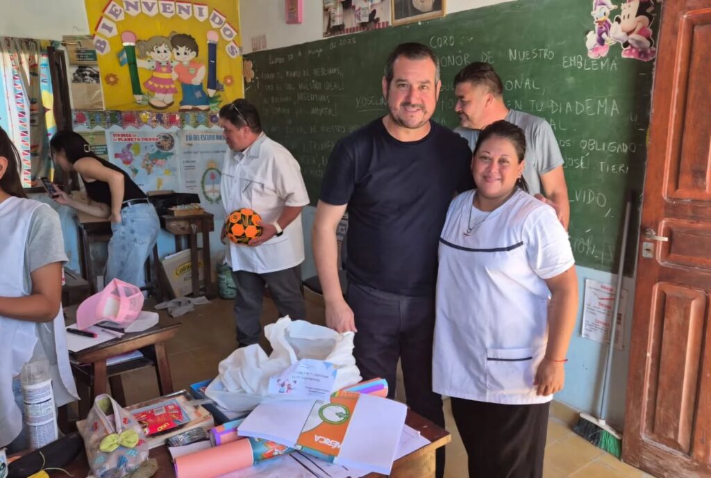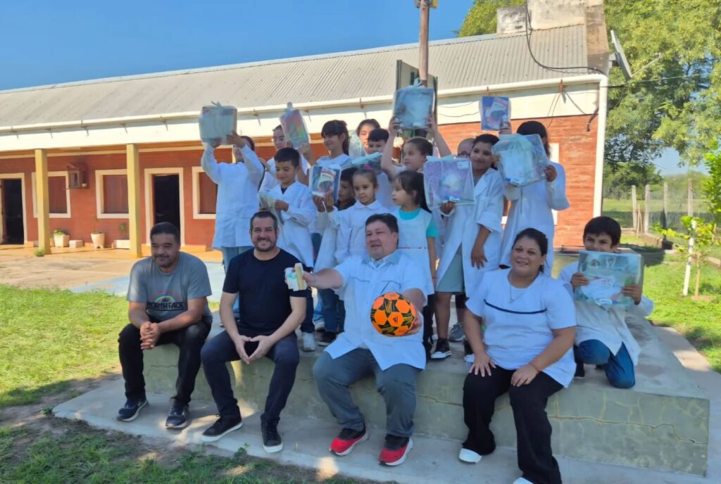 Como parte de la visita, se realizó la entrega de kits de útiles escolares, pelotas y materiales destinados a acompañar el trabajo pedagógico y las actividades escolares, con el objetivo de fortalecer el desarrollo educativo en estas zonas rurales.
