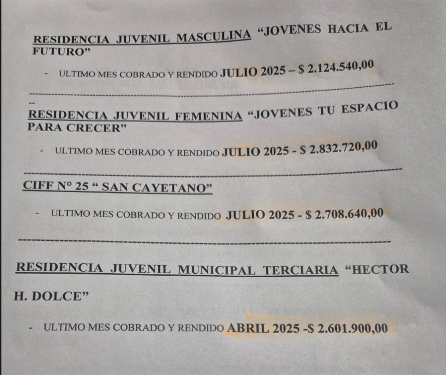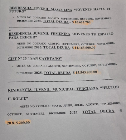 - CDI (Centro de Desarrollo Infantil): «En el 2024 tuvimos convenio y todavía nos adeudan la cuota de noviembre, que es de $1.200.000».