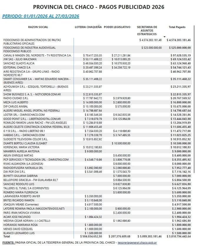 RESISTENCIA (TV LOCAL) – Los números de la austeridad no parecen llegar a la comunicación oficial. Según la planilla de pagos acumulados al 27 de marzo de 2026, la gestión provincial desembolsó la suma exacta de $5.810.794.443,64 en concepto de pauta publicitaria. La cifra, que equivale a un gasto diario de $67,5 millones, pone bajo la lupa las prioridades del Ejecutivo chaqueño en un contexto de fuerte ajuste para los sectores públicos.