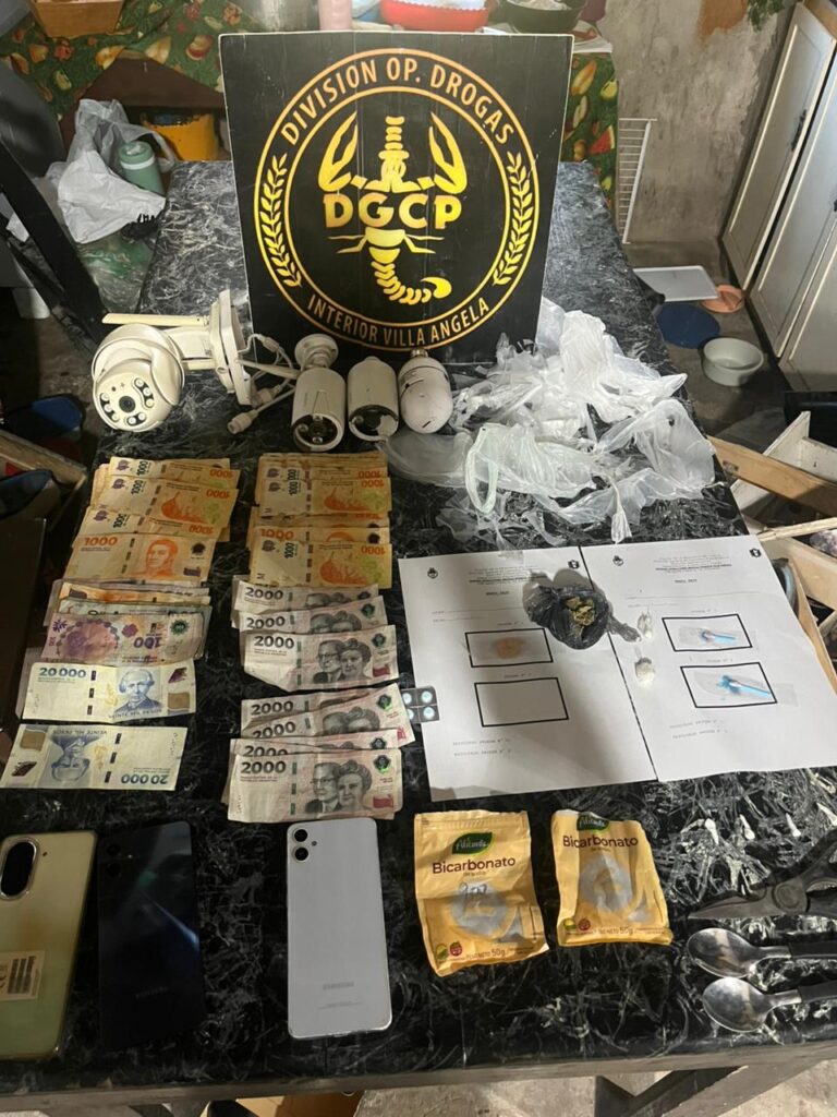 Además, se procedió al secuestro de tres teléfonos celulares, recortes de polietileno, sobres con bicarbonato, pastillas de clonazepam, una tijera, una cuchara con restos de sustancias y la suma de 107.500 pesos en efectivo, elementos considerados vinculados a la venta de estupefacientes.
