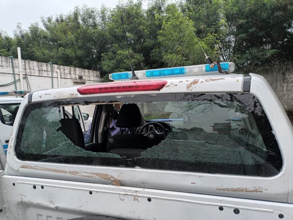 Durante el ataque, el móvil policial recibió un impacto que provocó la rotura de la luneta trasera, generando daños materiales.