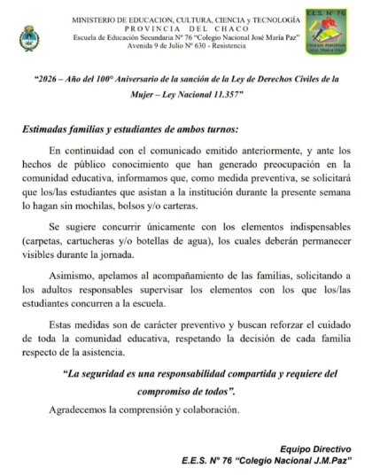 A través de un comunicado dirigido a las familias, la institución solicitó que los estudiantes asistan sin mochilas, llevando únicamente los elementos indispensables y visibles durante la jornada escolar. La decisión se tomó en el marco de una semana marcada por la preocupación en la comunidad educativa.