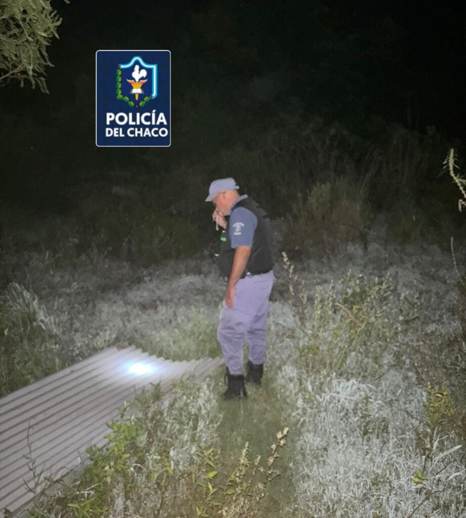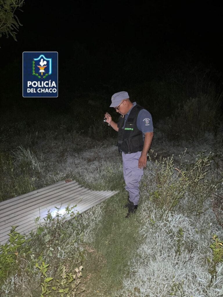 Luego de tareas investigativas y recorridas preventivas en la zona del hecho, efectivos policiales divisaron en un sector boscosa a dos sujetos con vestimenta oscura que trasladaban los elementos denunciados. Al advertir la presencia policial, los individuos arrojaron las chapas y se dieron a la fuga, sin lograr ser identificados.