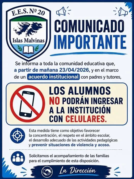 En un contexto de creciente preocupación por la seguridad en las instituciones educativas, la E.E.S. Nº 20 «Islas Malvinas» decidió prohibir el ingreso de estudiantes con teléfonos celulares, en una medida que busca reducir riesgos ante la seguidilla de amenazas que atraviesa la provincia.