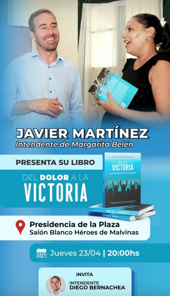 PRESIDENCIA DE LA PLAZA (Especial). En el marco de una recorrida que ya ha visitado diversos puntos del interior chaqueño, el Intendente de Margarita Belén, Javier Martínez, presentará formalmente su libro titulado «Del Dolor a la Victoria: Cuando la adversidad la convertimos en impulso político». El evento tendrá lugar hoy, jueves 23 de abril, a las 20:00 horas en el emblemático Salón Blanco «Héroes de Malvinas».