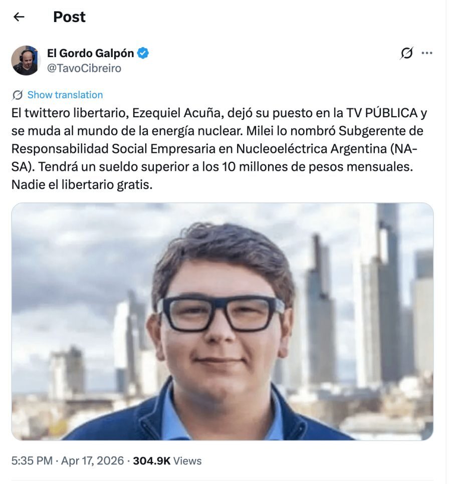 El caso también puso en discusión uno de los ejes discursivos del oficialismo: la meritocracia. Acuña, que en redes sociales cuestionaba a quienes “vivían del Estado”, ahora ocupa un cargo público con un salario elevado dentro de una empresa estatal.