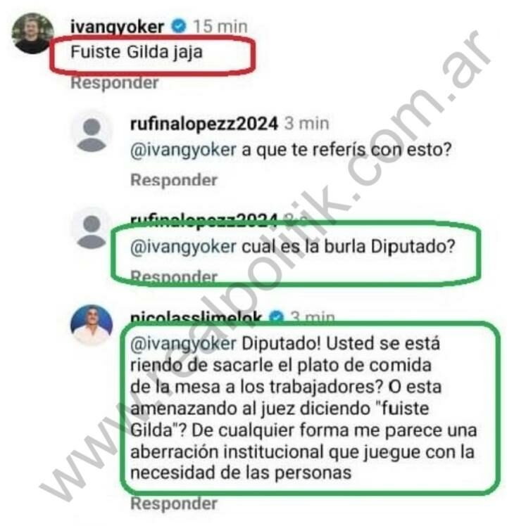 Luego de que trascendiera el encuentro, el diputado oficialista Iván Gyöker publicó en redes sociales la frase “Fuiste Gilda, jaja”, lo que fue interpretado por sectores judiciales como una posible amenaza.