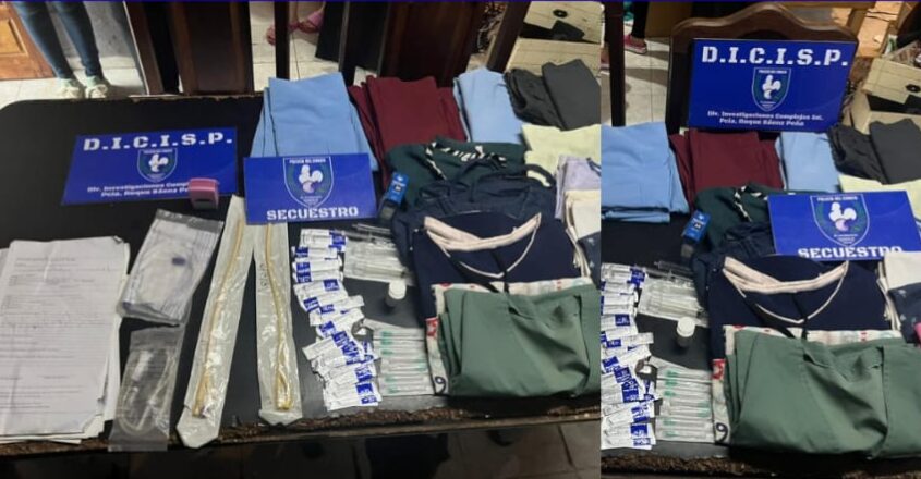 Según informaron fuentes judiciales, durante el allanamiento se incautaron jeringas, un set de infusión intravenosa, uniformes de enfermería, chaquetas médicas y documentación vinculada a pacientes. Además, en el patio de la vivienda se hallaron restos de papeles parcialmente incinerados, entre los cuales se identificó un fragmento con un sello del Ministerio de Salud Pública y la referencia al Hospital “Dr. Emilio F. Rodríguez” de Quitilipi.