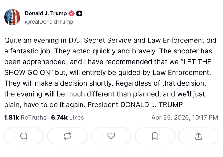 “Vaya noche en D.C. El Servicio Secreto y las fuerzas de seguridad hicieron un trabajo fantástico. Actuaron rápido y con valentía. El tirador fue detenido”, expresó Trump en su mensaje.