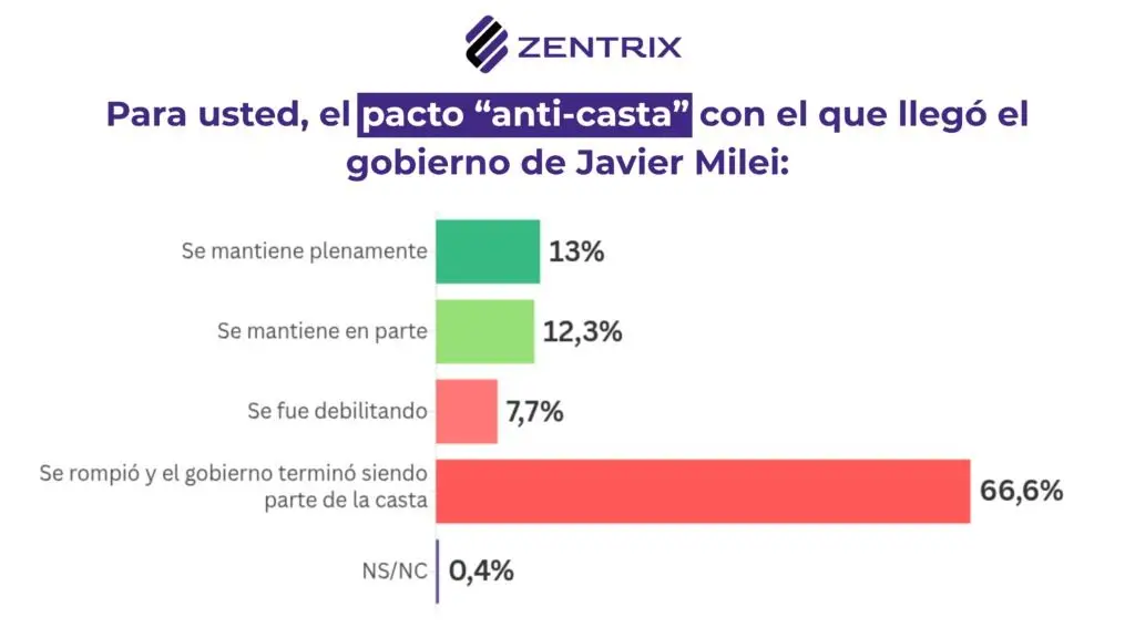 Según el informe, el 66,6% de los consultados cree que el pacto “anticasta” de Milei “se rompió” y que el Gobierno terminó integrando ese mismo esquema. A ese número se suma un 7,7% que considera que el concepto se fue debilitando, lo que amplía la percepción negativa.
